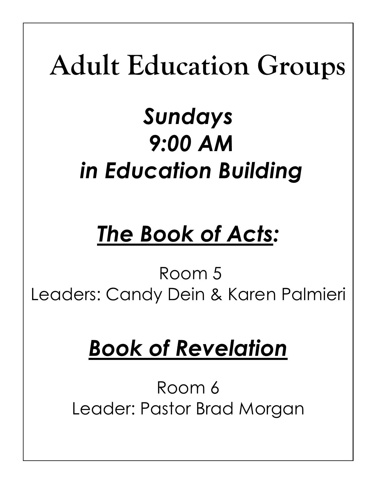 Sunday: Adult Ed Groups – Engage in meaningful discussions and grow in your faith.